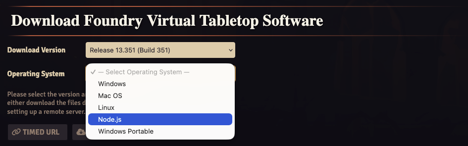 Du erhältst eine URL, die du gleich in den Befehlwgeteinsetzt um die Archivdatei zu laden und als foundryvtt.zip lokal im Installationsverzeichnis abzuspeichern. - Foundry‑Archiv herunterladen (in