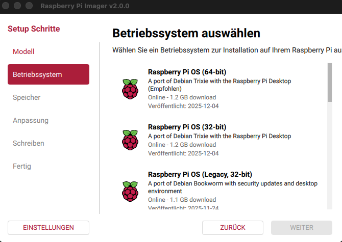 Der Imager bietet eine Auswahl gängiger Systeme wie Raspberry Pi OS sowie weitere empfohlene oder alternative Betriebssysteme. Die Auswahl hängt von Modell und Version ab.