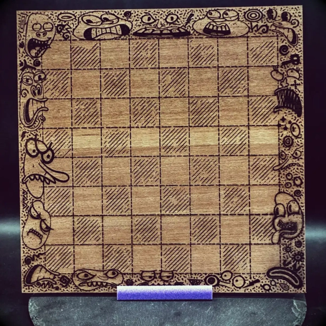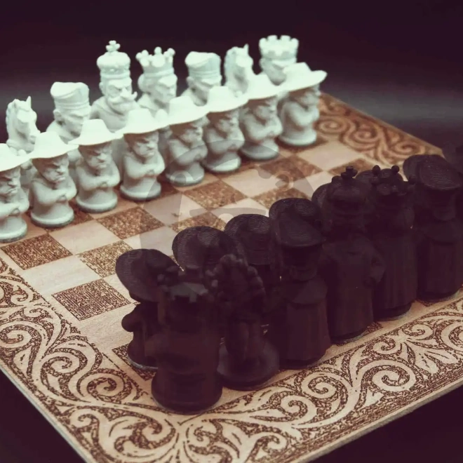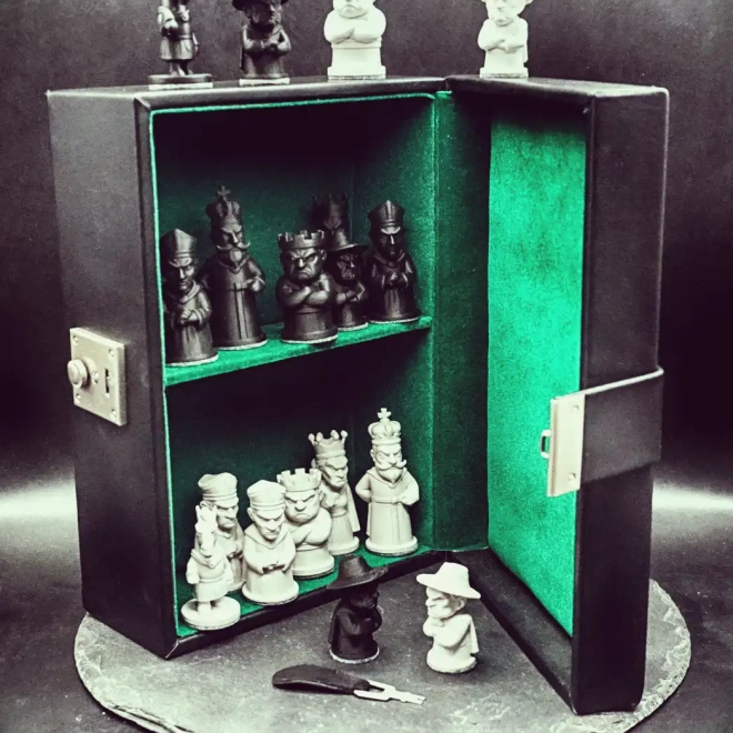 Das „Grumpy Chess“-Set richtet sich an alle, die Schach nicht nur spielen, sondern erleben wollen. Jede Figur trägt ihre schlechte Laune mit sichtbarem Stolz, vom missmutigen Bauern bis zum genervten König, der mit seinen rund 7,5 cm Höhe über das Brett blickt, als würde er jeden Zug infrage stellen. Die Formen sind klar, markant und bewusst charakterstark gehalten, sodass jede Partie eine kleine Erzählung zwischen Widerwillen und Strategie wird. Geliefert wird das Set in einer verschließbaren Lederkiste, die den Figuren nicht nur Schutz bietet, sondern ihnen auch eine Bühne verleiht. Das beiliegende Schachbrett aus sauber gelasertem Material ergänzt die Kollektion mit einer präzisen, ruhigen Oberfläche, auf der die grummeligen Charaktere besonders gut zur Geltung kommen. Ebenfalls dabei: Ein handgemachtes, gelasertes Schachbrett auf Holz, das wie ein kleines Artefakt aus einer verspielten Parallelwelt wirkt. Das 8×8‑Raster schimmert zwischen klaren Linien und feiner Schraffur, während die umlaufenden Gravuren wie spontane Eingebungen eines wandernden Stifts erscheinen – lebendige Miniaturen, die dem Brett eine fast erzählerische Aura verleihen. Die Kombination aus präziser Laserarbeit und frei fließender Ornamentik erzeugt eine reizvolle Spannung zwischen Struktur und Fantasie, ein Objekt, das sowohl als Spielbrett wie auch als kleines Kunstwerk funktioniert. Ob als Geschenk, Sammlerstück oder persönliches Lieblingsset schafft ein Spielerlebnis, das ebenso eigenwillig wie unverwechselbar ist. Wer ein Schachspiel sucht, das mehr erzählt als nur Züge, findet hier eine Kollektion, die mit jedem Blick ein neues Grummeln offenbart und dabei langlebig, stabil und detailreich bleibt. Grössen: König - ca 8cm Schachbrett - ca 30x30 cm Lederkiste - 26cm x 18cm x 11cm